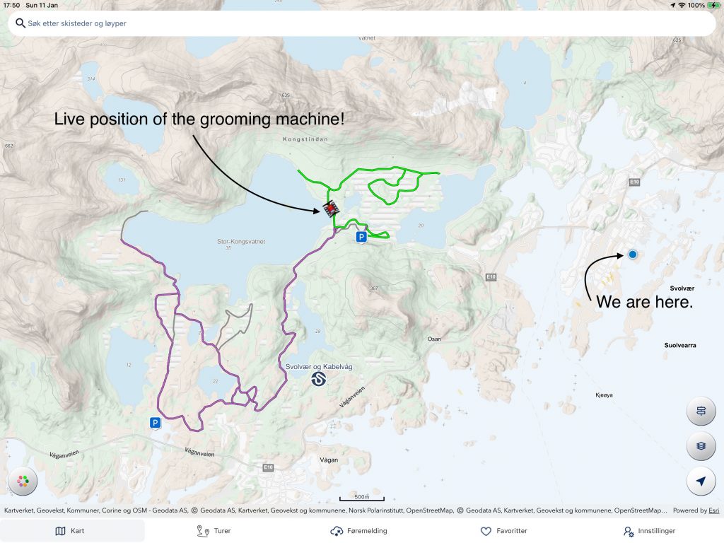 Around 15cm of fresh snow came in today within 3 hours. Another 3 hours after it stopped snowing, the grooming machine was out in the plains to overhaul the x-country skiing track. Its movement and the status of preparation can be followed live on the sporet.no App, once you have a subscription.
