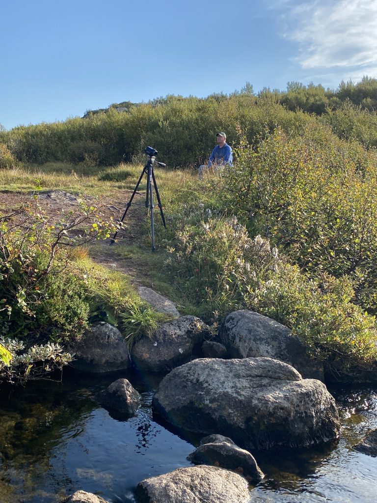 Arriving in Kalle, Oddmar, made this ride very special. A former teacher and today a retired nature lover, sitting on a rock at the river near Kallevatnet. 5 cameras in place, 4 GoPro in the river under water and 1 Rollei on a tripod above. The cameras counting fish and its movements. Being in the third year now, he starts to believe his research might finally indicate, that the herring is more robust against water temperature increase while the trout moves to colder waters, up the river. After a million more questions, I had to move on. Inspiring.
