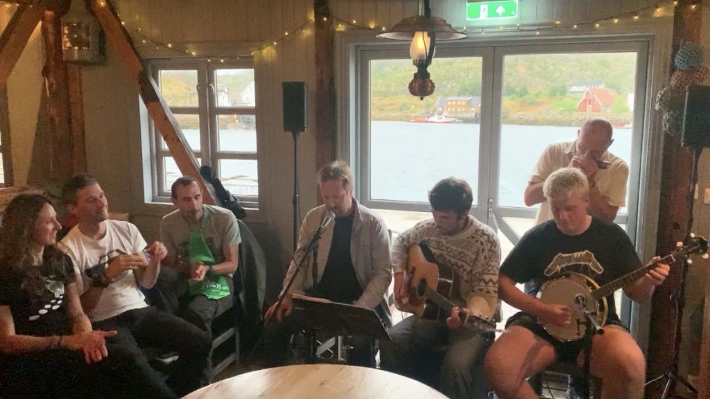 There is not a much better way than letting another gale pass through while sitting in a cosy pub. Well, the pub here on Skrovøya is called HeimBrygga and the peak of the gale at 9pm was perfectly matching the start of the farewell jam session attributed to the Conroy brothers. Irish Folk(s).